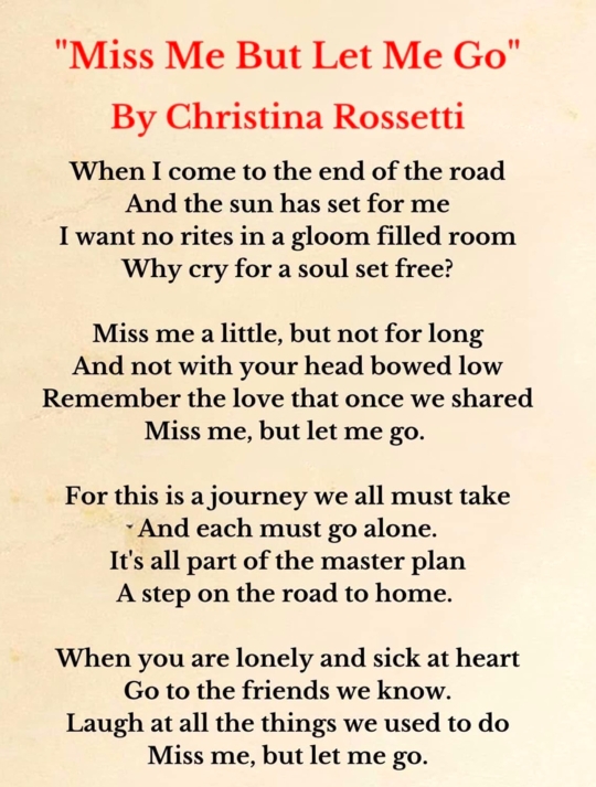 Kenneth Wyman is survived by Felicity, his wife of almost 55 years. Felicity has asked us to share the following poem by Christina Rossetti (1830-1894), which has brought her some comfort: